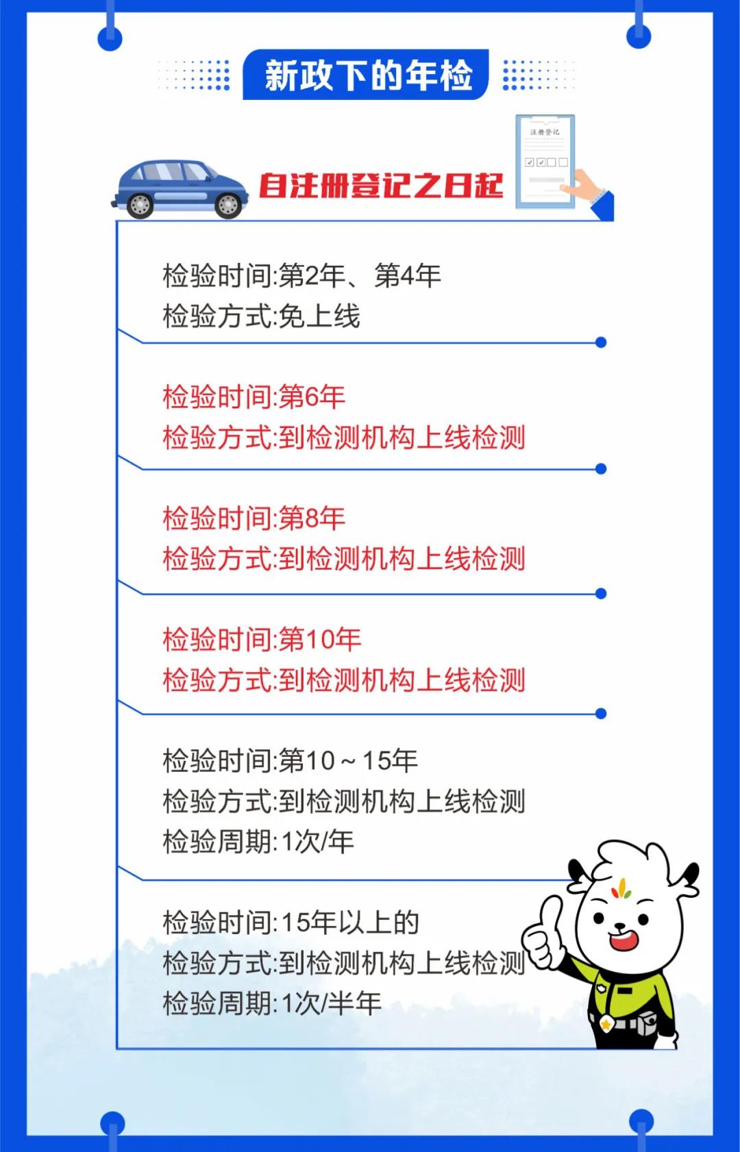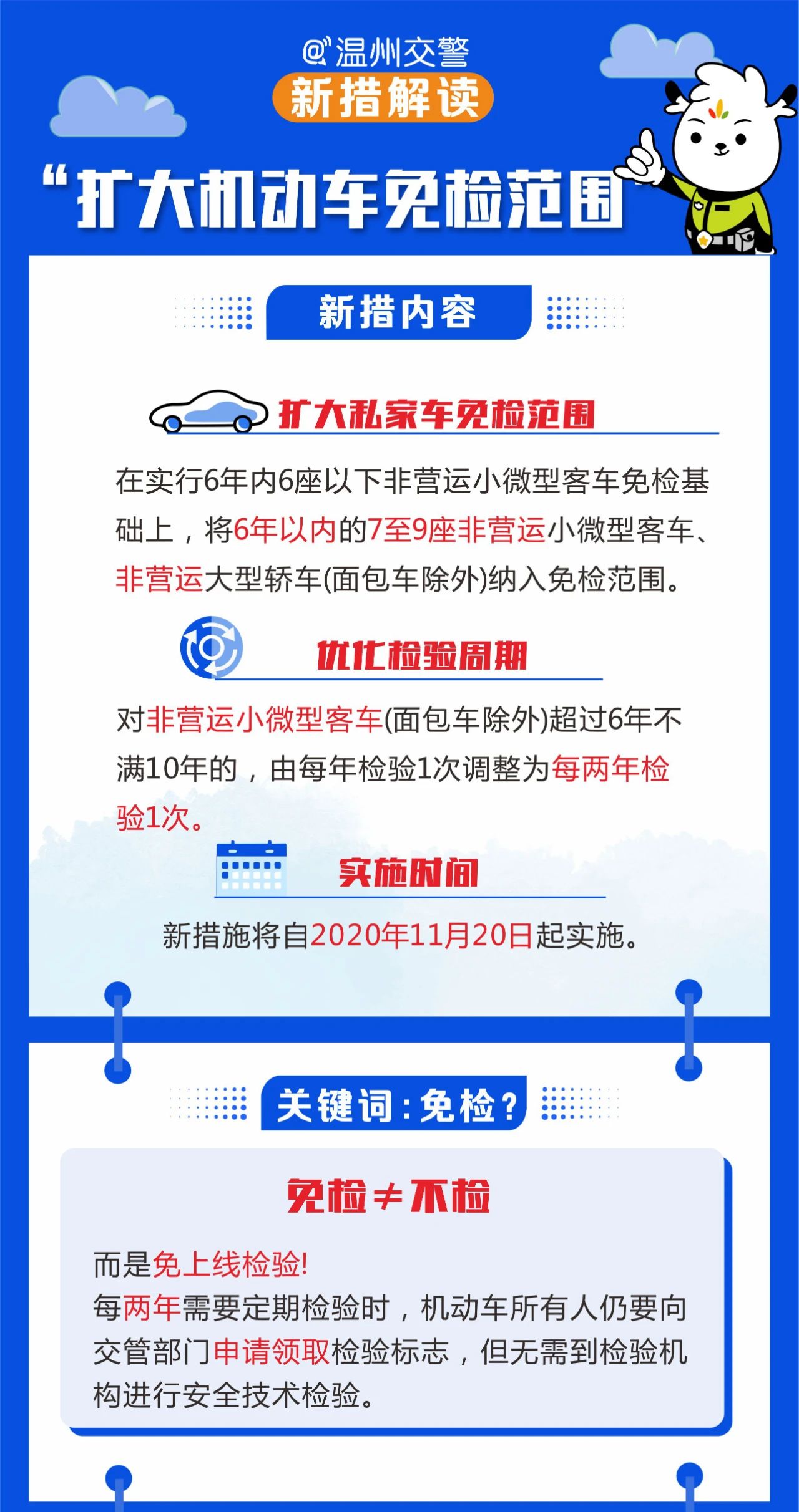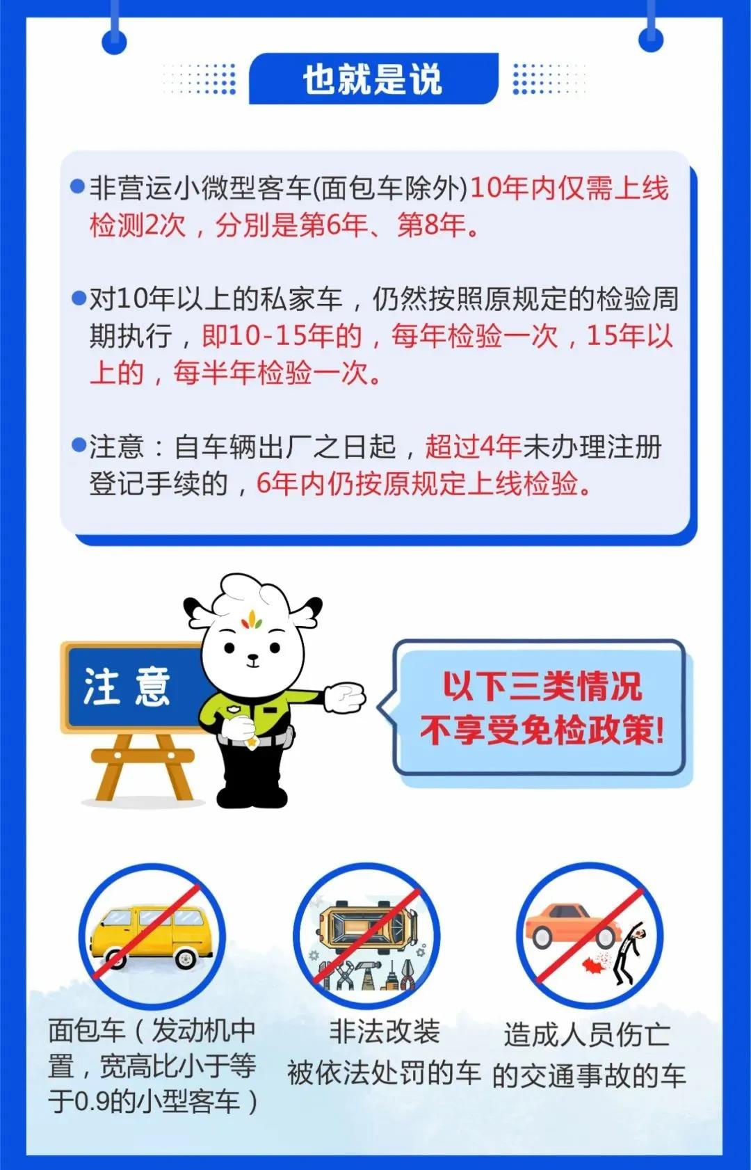 本次改革措施明确,在实行6年内6座以下非营运小微型客车免检基础上,将6年以内的9座以下非营运小微型客车、非营运大型轿车纳入免检范围,对非营运小微型客车超过6年不满10年的,由每年检验1次调整为每两年检验1次。县交警大队车管所所长周景裕表示:“面包车、非法改装被依法处罚的车辆还有发生了伤亡交通事故的车辆不享受这个政策。”此外,值得注意的是,免检并不等于不检,而是免上线检验,每两年需要定期检验时,机动车所有人仍要向交管部门申请领取检验标志,但无需到检验机构进行安全技术检验,并且,自车辆出厂之日起,超过4年未办理注册登记手续的,6年内仍按原规定上线检验。