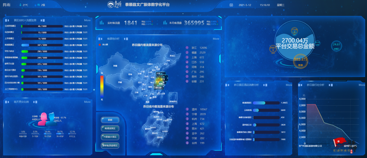 数据上“云”,管理才能更高效。景区实时人流量、国内客流来源分布、酒店预定入住情况、出入游客画像描绘……这些曾经分散的数据,如今汇集在泰顺数字文旅管理平台。