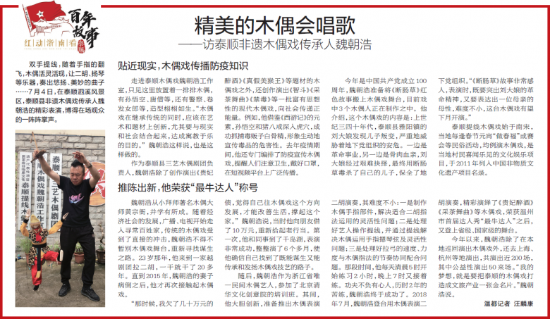 今年以来,魏朝浩除了在本地巡回演出木偶戏外,还去上海、杭州等地演出,共演出近200场,其中公益性演出50来场。“我的梦想,就是要把泰顺的木偶戏打造成文旅产业一张金名片。”魏朝浩说。