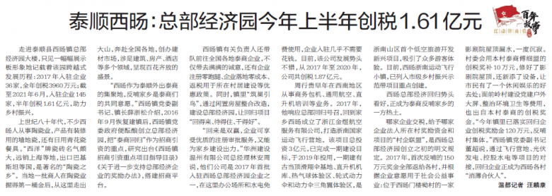 走进泰顺县西旸镇总部经济园大楼,只见一幅幅展示板形象地记载着该园跨越式发展历程:2017年入驻企业36家,全年创税3960万元;截至2021年6月,入驻企业145家,半年创税1.61亿元,助力乡村振兴。